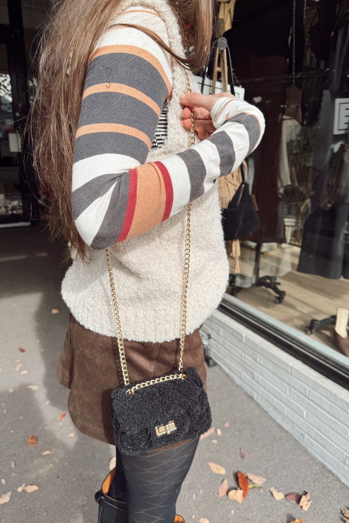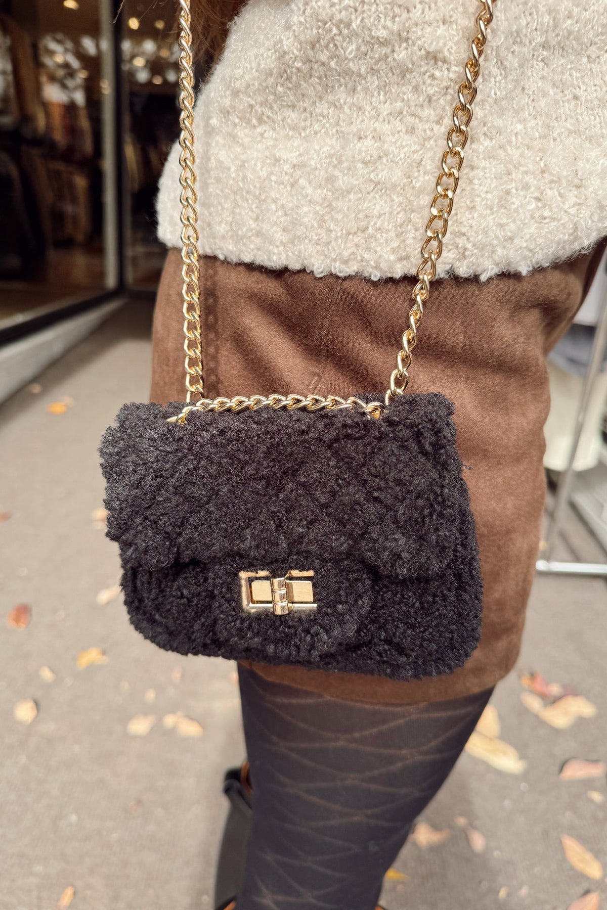 Regular price $20.00 Sale price $18.00 Save $2.00Cozy meets chic with this quilted sherpa mini bag! Featuring a plush sherpa exterior with a gleaming gold latch and matching chain strap, it's the perfect blend of comfort and glamour. The double strap design lets you wear it as a shoulder bag, keeping your hands free while you're on the go. Just enough to hold all your essentials—lip gloss, card, cash, and a key-without the bulk.