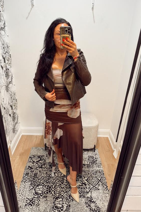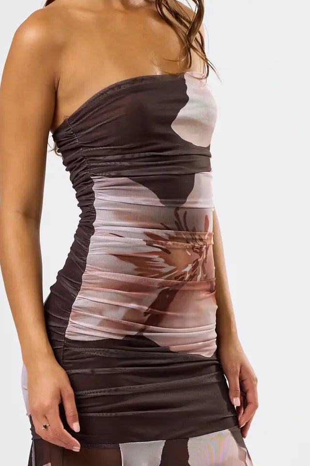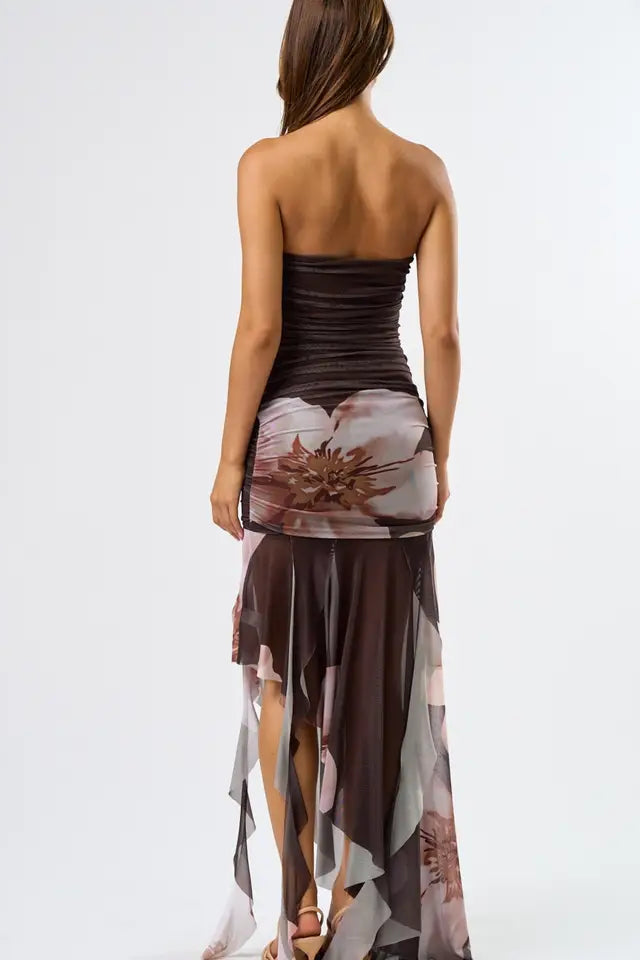 This flirty midi length dress is designed with a ruched bodice that highlights your silhouette with a playful twist. Its bold large floral print adds vibrant charm, while the mesh ruffle bottom brings a fun, feminine finish. Ideal for making a joyful statement wherever you wear it.